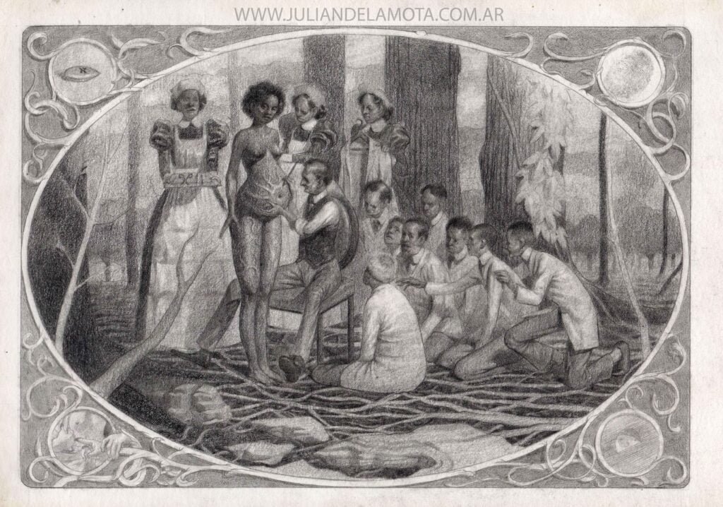 Representación proyectiva que muestra una de las posibilidades que podría arrojar una máquina de hacer proyecciones sobre posibilidades futuras cuya invención se cree estaba en proceso hacía fines del siglo XIX. En base a un plano de esta misma se arrojó lo que sería una proyección ilustrada sobre una lección, o curso intensivo, de medicina decorativa al aire libre hacía principios del S XXI.