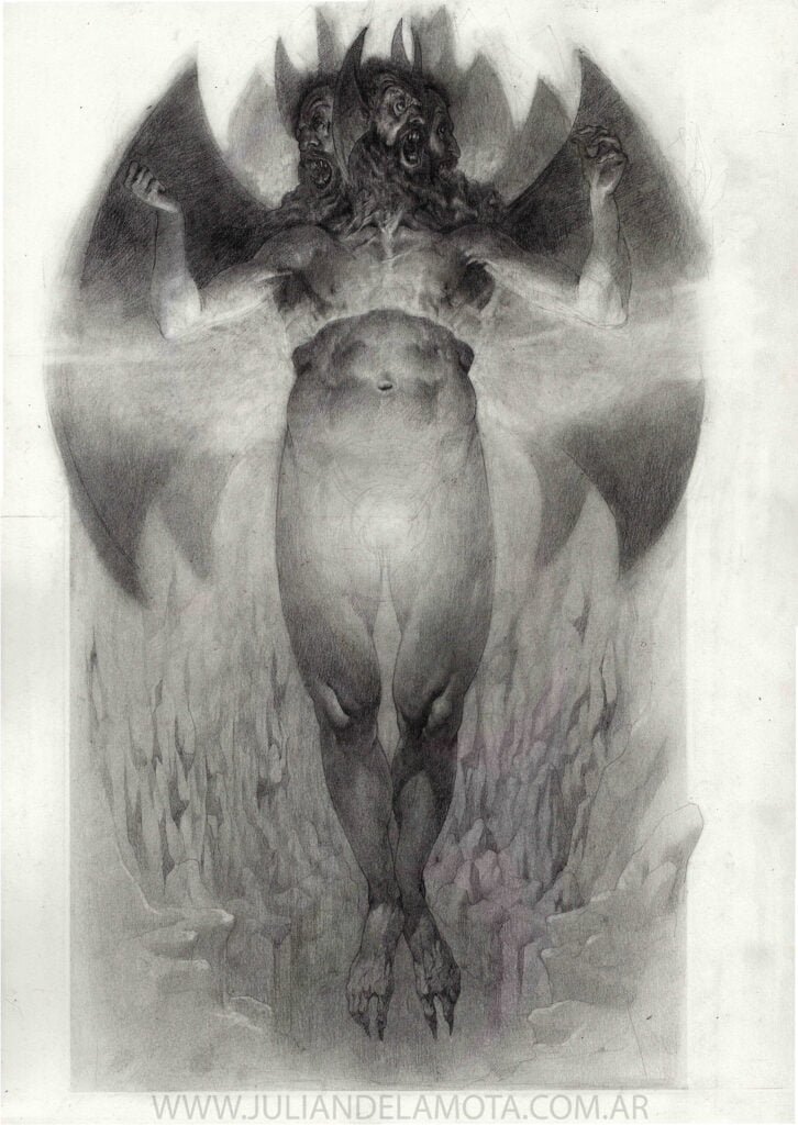 Perteneciente al libro «Infierno de Dante Alighieri» con traducción de Alejandro Crotto e ilustraciones de Julián de la Mota. Editado por Audisea