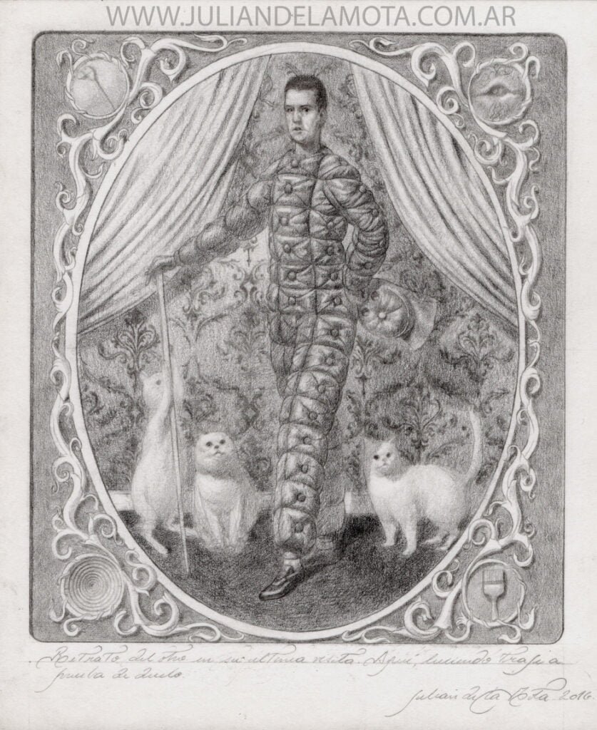 Texto en obra: Retrato del otro en su última visita. Aquí, luciendo traje a prueba de duelo.